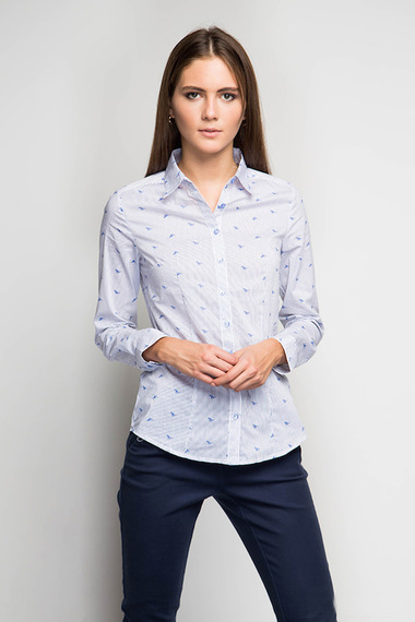 Блузка с длинным рукавом, приталенного кроя. Модель выполнена из хлопковой ткани в тонкую голубую полоску.